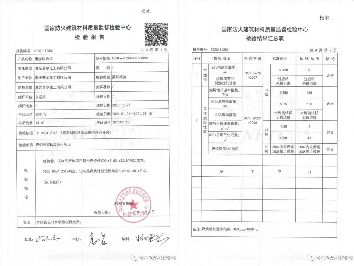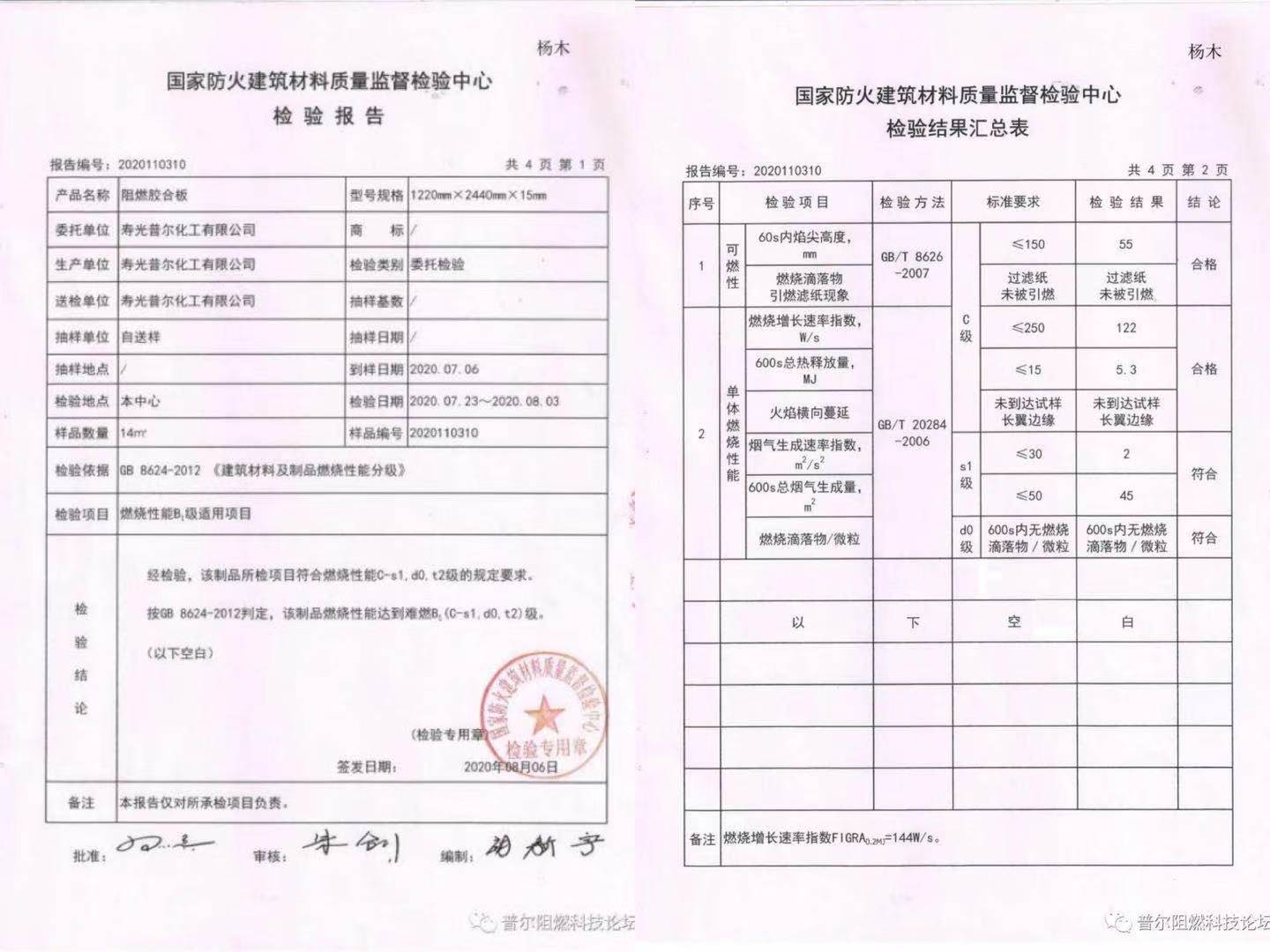 用阻燃劑AP1028制造的楊木阻燃板、松木阻燃板完全通過國家防火建筑材料質量監督檢驗中心的阻燃檢測。