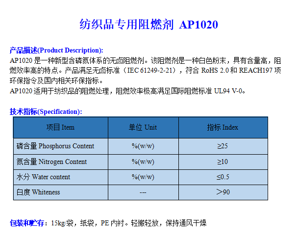 紡織品專用阻燃劑AP1020 2022-6-1 本文被閱讀 3212 次